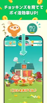 LINE ポイ活チョッキンズでは放置するだけでチョッキンズがコインを集めてくれる。集めたコインはLINEポイントに交換OK。育成すると、もっと効率よくコインが貯まる!
