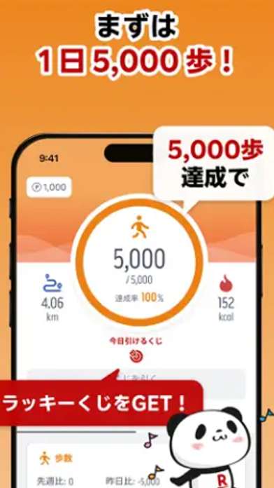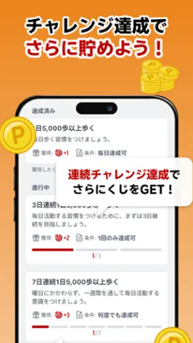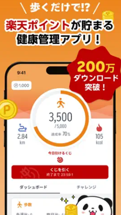 2. 基本操作:ホーム画面で歩数や達成率を確認。日々の歩数は自動で計測され、ポイント獲得状況もリアルタイムで表示されます。