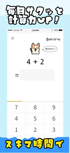 2. 基本操作:出題される計算問題を暗算で解き、画面をタップして回答を入力。正解すると犬キャラが応援してくれます。