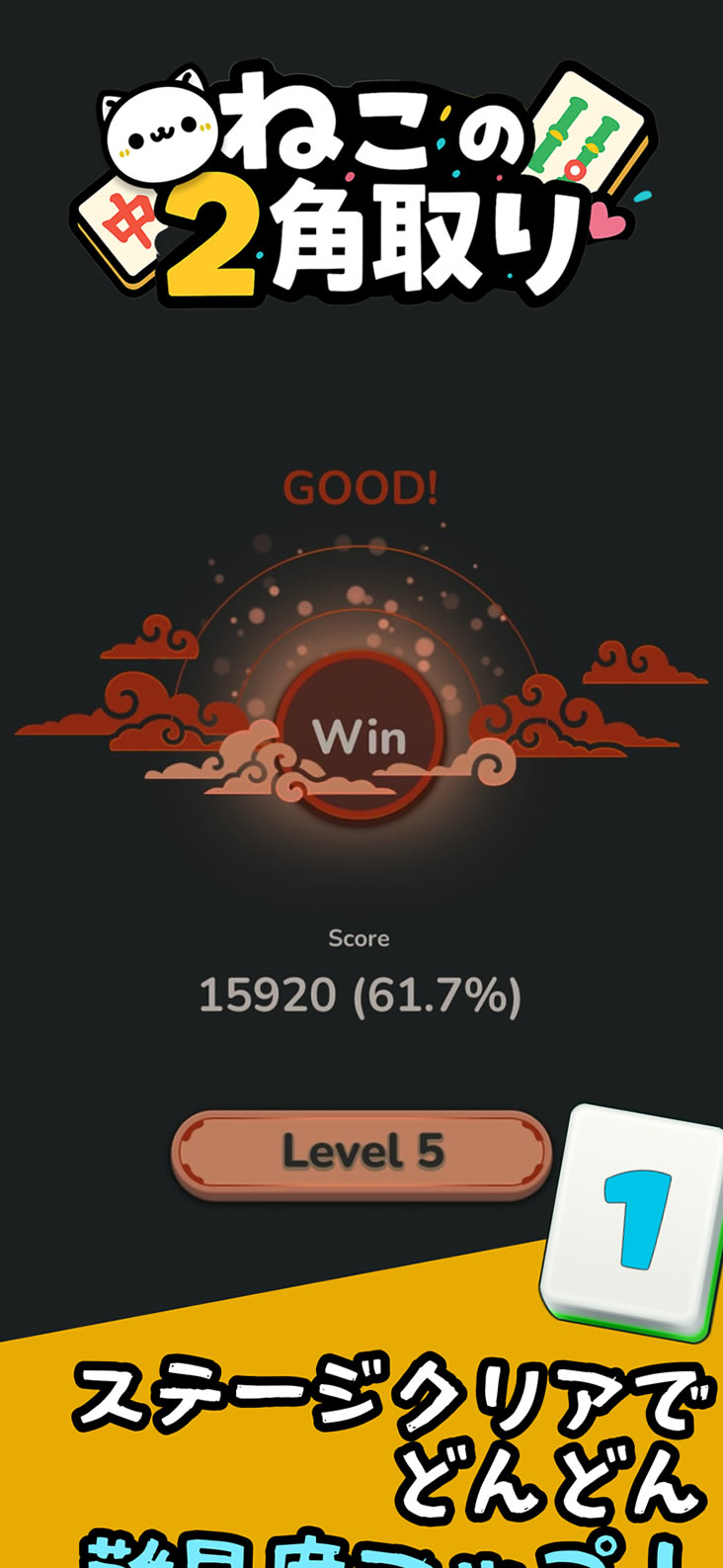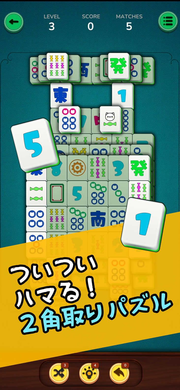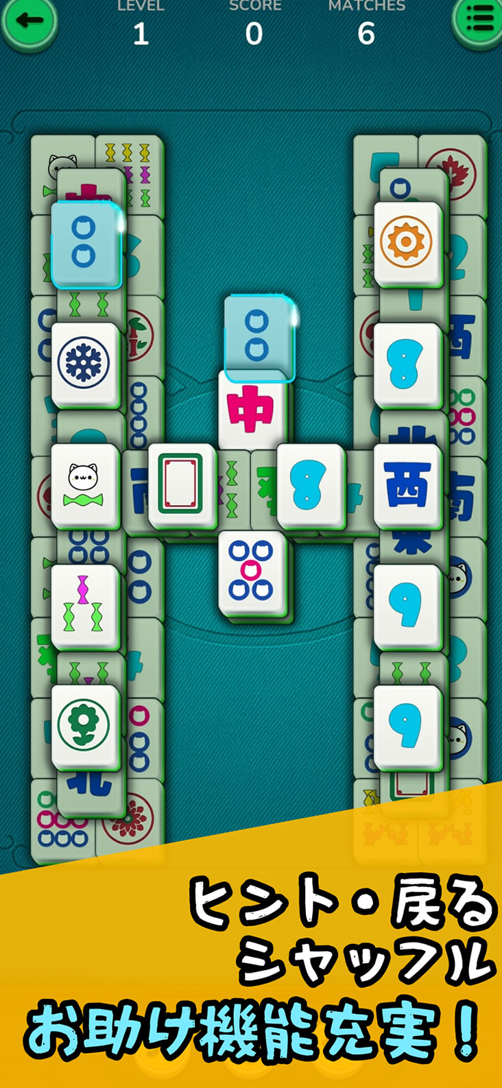 主な機能:猫牌/麻雀牌の切替、ヒント、シャッフル、一手戻す、BGM/効果音設定、レベル進行