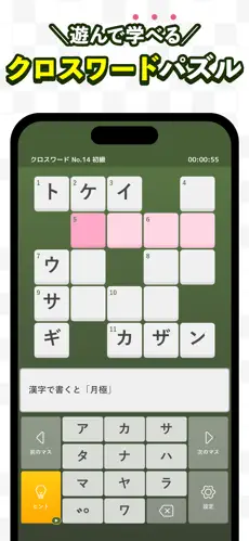 マス目にヒントの答えを埋めていき、すべてが正しく繋がるとクリア。定番のクロスワード形式で、知識・語彙力・連想力を使って楽しめます。