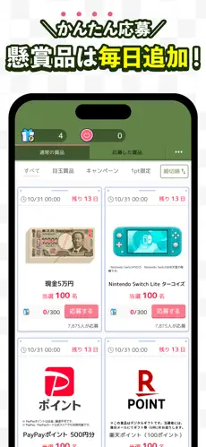 3. 応募:貯めたポイントでアプリ内の懸賞に応募。抽選結果は通知やアプリ内で確認可能。
