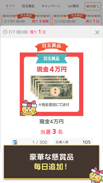 3. 応募:一定スコアや条件を満たすと懸賞応募ポイントが付与され、抽選に参加可能。