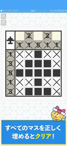 縦横に記された数字を手がかりにマスを塗り、正解のイラストを完成させるのが基本です。いわゆる「イラストロジック」「ノノグラム」と呼ばれるジャンルです。