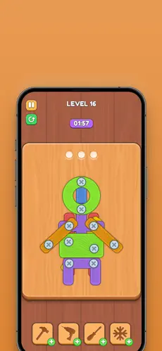 ナットやボルトを動かし、正しい位置に揃えることでステージをクリアするパズル形式。シンプルな構造ながら、考える力を刺激する要素が満載です。