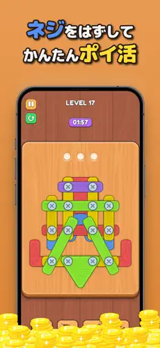 主な機能:ナットを動かして揃えるパズル要素、クリアによるポイント獲得、直感的な操作、段階的に難しくなるステージ