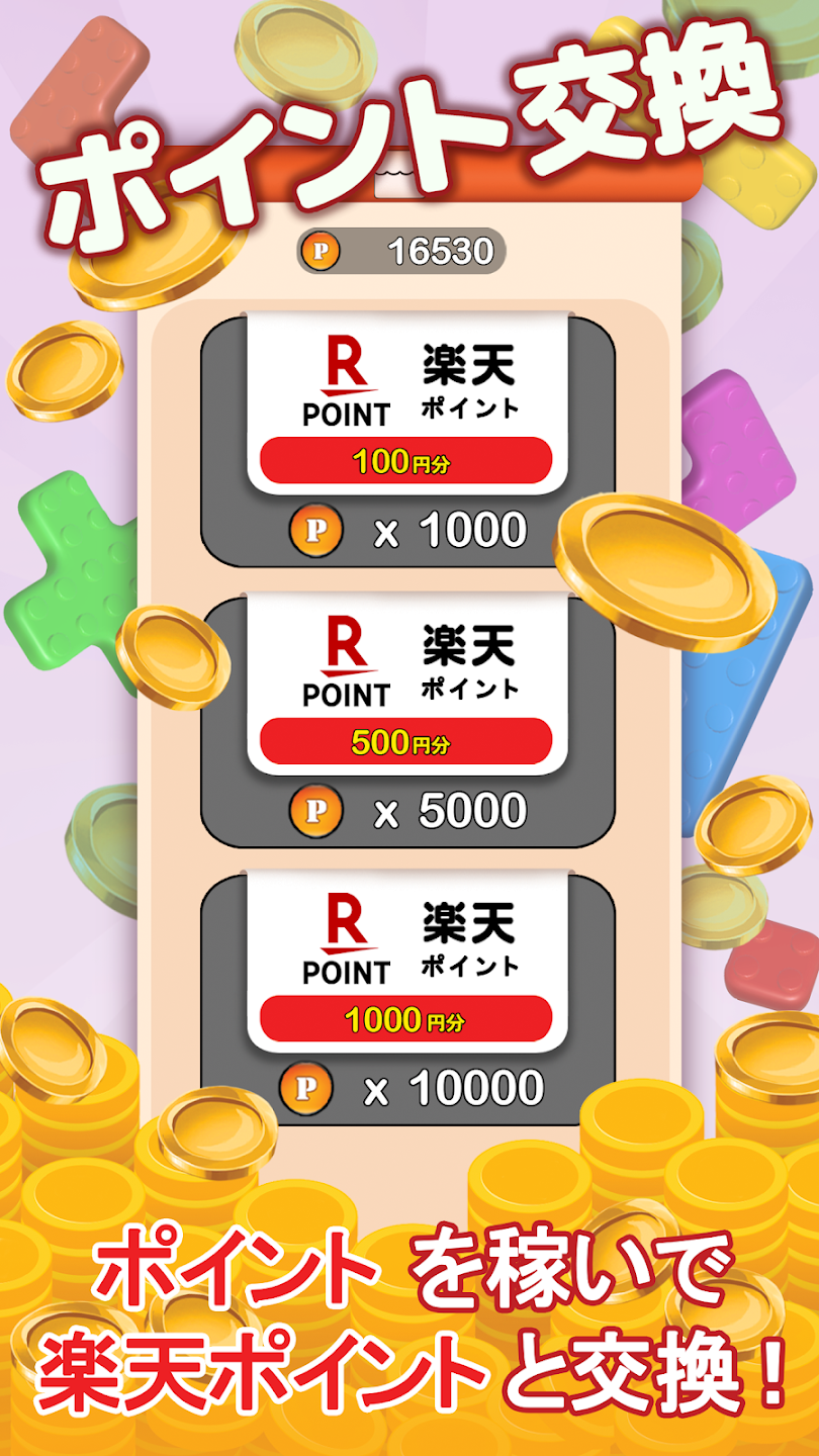 主な機能:ブロックを消すパズルプレイ、スコア獲得、一定条件でポイントが貯まる仕組み、シンプルな操作性、広告視聴による追加報酬