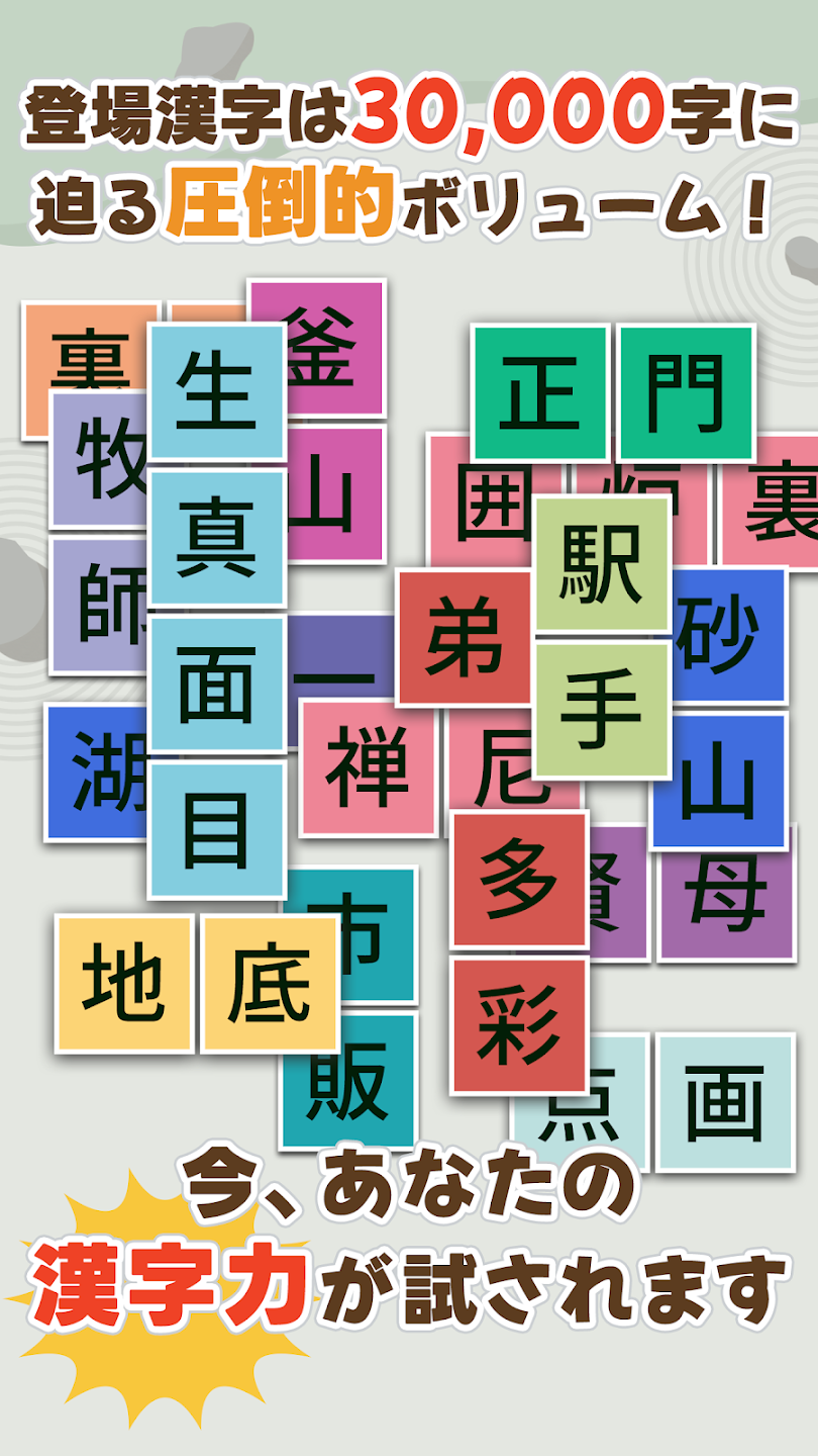 主な機能:漢字クイズ(読み・書き・意味)、ランダム出題、レベル別問題集、スコア加算機能、ポイント獲得システム、広告視聴による追加特典