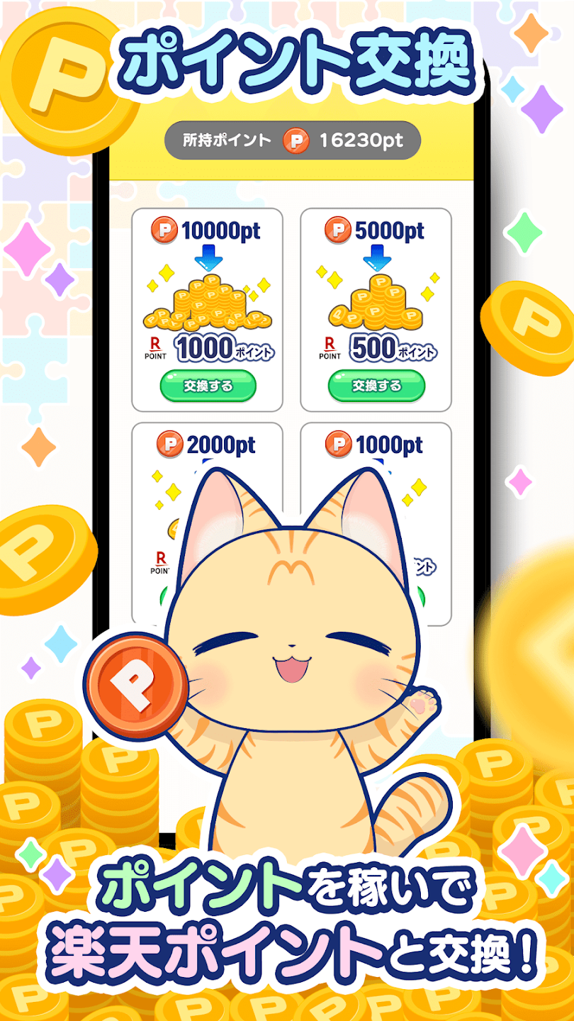 主な機能:かわいい動物写真のジグソーパズル/1000以上の豊富なステージ/完成図のON・OFF切り替え/ヒントコイン機能/デイリーミッションと無料ガチャによるコイン獲得/ポイント連携要素(ストア説明準拠)