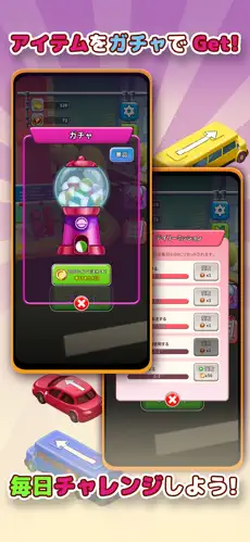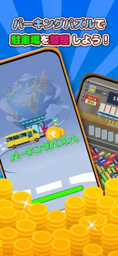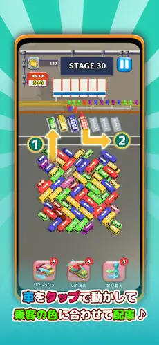 バラバラな向きに配置された車やバスを駐車スペースに移動して、同じ色のお客さんを乗せていく車整理パズルゲームです