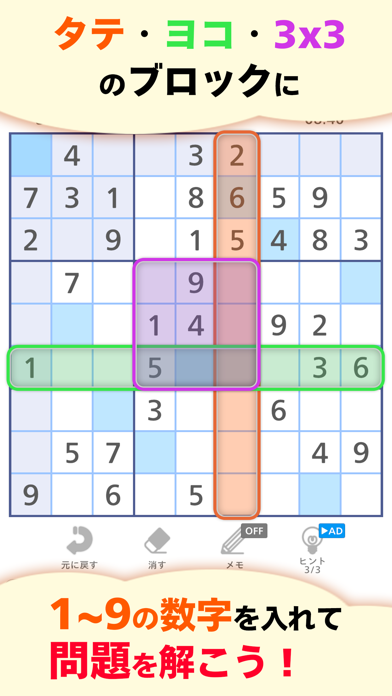 広告はこういうものと割り切ってプレイ出来るので良いのですが、下記の点を直して欲しい。 ・正解したマスに入力出来てしまいミス扱いになる→正解したマスは入力不可にするとか ・同じ数字を連続で入力出来るようにして欲しい→難易度が高いとノートの使用頻度も高くなるので連続入力がないと上級1回より初級2回の方が速い ・ノートモードにすると使い切った数字が入力出来る→不要