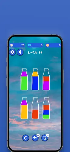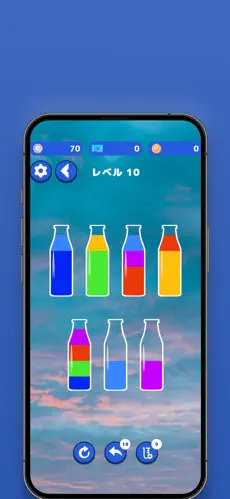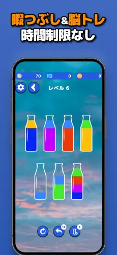 スキマ時間の暇つぶし(ひまつぶし)無料ゲームです。初心者から上級者まで楽しめる脳トレにもなるゲームで、あたまを使うパズルゲームとして人気です。グラス(試験管)をタップして色水を注ぎ、同じ色の水を一つのボトルに並べ替える中毒性のあるパズルゲーム。
