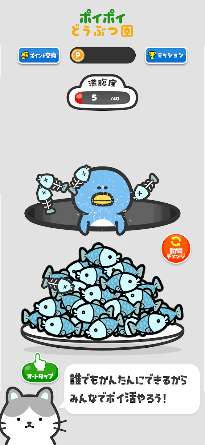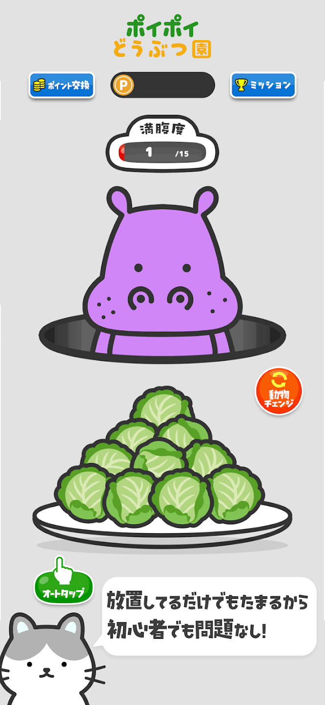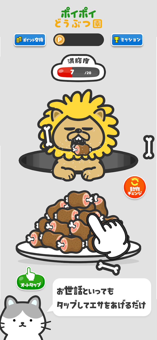 必要なのはタップだけ、動物たちが満腹になればポイントGET!