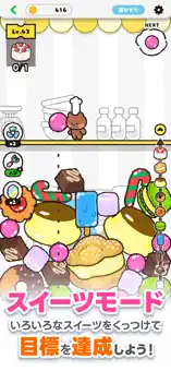 同じスイーツをぶつけてクリア条件となるスイーツになるまで「進化」させる、シンプルなパズルゲームだよ。