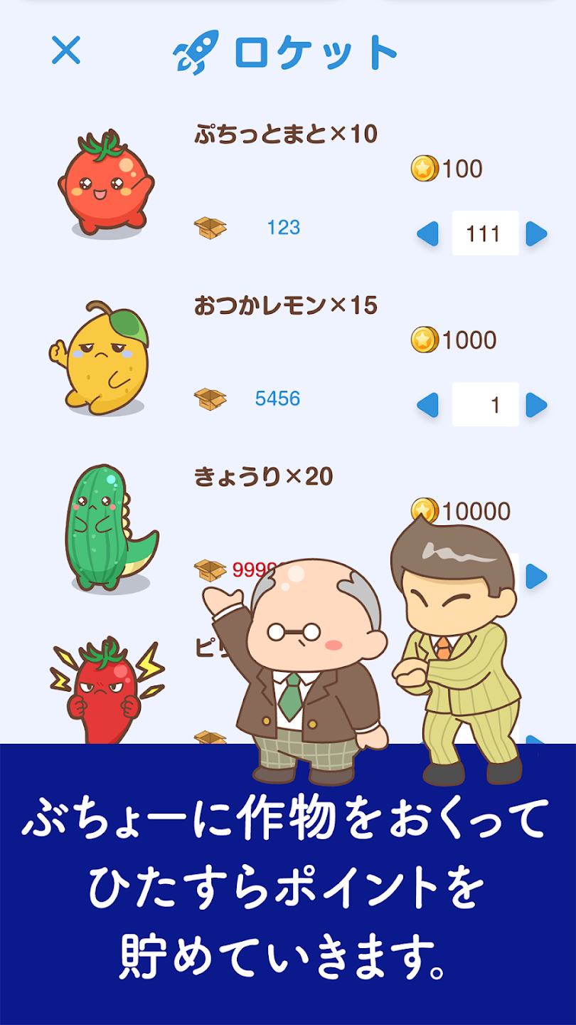 ぶちょーに収穫した作物をおくって、コインを貯められます!どんどん作物を育てよう!