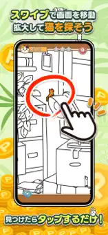 『Pにゃんこをさがせ!』は猫を探して見つけたらタップするだけ!誰でもかんたんに遊べます。部屋の中やお庭、お屋敷や街の中にいるたくさんのにゃんこを次々に見つけていく探し物ゲームです。